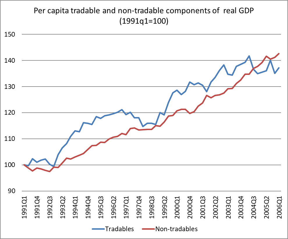 My second chart has, over time, raised more hackles. Almost 20 years ago a visiting IMF mission team were looking at how the (then newly) rising exchange rate was affecting the economy, and one of their people put together a chart crudely illustrating the relative performance of the tradables and non-tradables sectors of the economy. Tradables here was represented by the production GDP components for the primary and manufacturing sectors, to which was added (in a way that makes statisticians wince, but which isn’t without meaning) exports of services from the expenditure GDP accounts. They were, loosely, the bits of the economy either producing for exports or facing direct international competition. The non-tradables component was the rest. I think I later hit on the idea of expressing the series in per capita terms, to cope with longer runs of time.