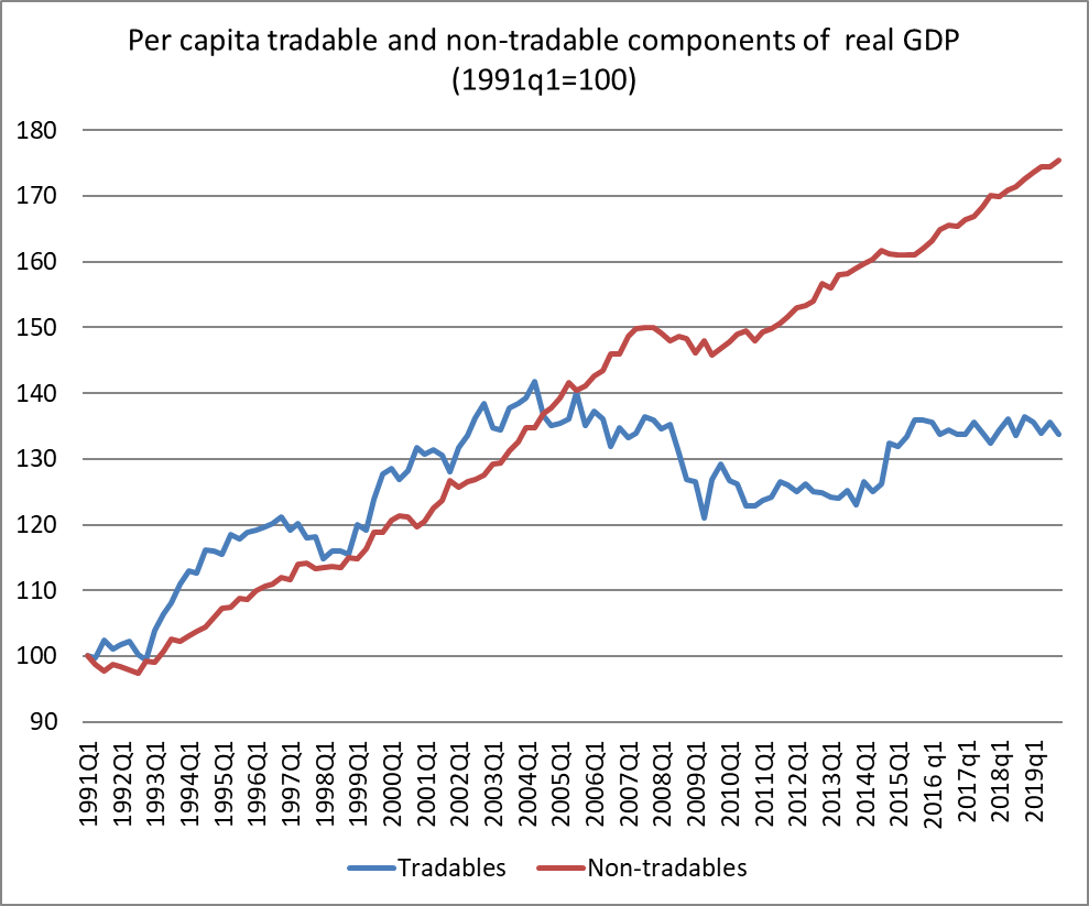 My second chart has, over time, raised more hackles. Almost 20 years ago a visiting IMF mission team were looking at how the (then newly) rising exchange rate was affecting the economy, and one of their people put together a chart crudely illustrating the relative performance of the tradables and non-tradables sectors of the economy. Tradables here was represented by the production GDP components for the primary and manufacturing sectors, to which was added (in a way that makes statisticians wince, but which isn’t without meaning) exports of services from the expenditure GDP accounts. They were, loosely, the bits of the economy either producing for exports or facing direct international competition. The non-tradables component was the rest. I think I later hit on the idea of expressing the series in per capita terms, to cope with longer runs of time.