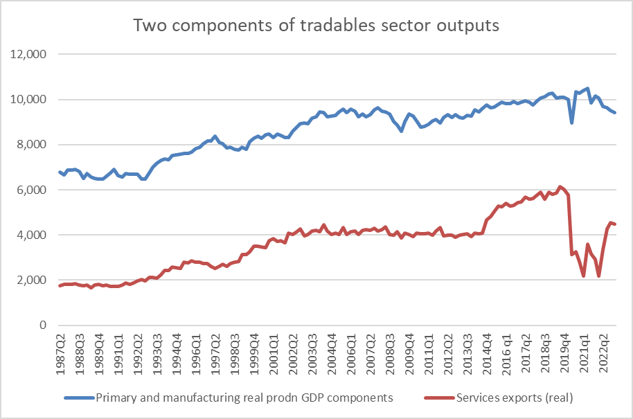 And sure enough the data (seasonally adjusted but not per capita here) show that services exports have recovered a lot as the Covid restrictions were lifted. But notice the blue line, the GDP components of the primary and manufacturing sectors. It has its ups and downs but the level of the latest observation was first reached in 2004Q1 (when the population has only just passed four million).