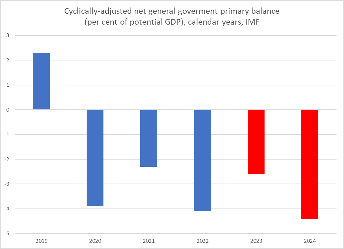 The blue numbers are more or less solid (actual fiscals are, but the cyclical adjustments could still change a bit), while the red numbers – calendar 2023 and 2024 – are going to be heavily influenced by choices and decisions the government has already made. The best advice from the IMF is that no progress has been made in reducing the deficits first run up in the Covid disruption years, even though actual Covid spending is no longer a thing. The Fund includes projections for the further-out years in which the operating balance goes back to respectable surplus for calendar 2027 and 2028, but those are really just assumptions, and don’t rely on specific identifiable tax or spending decisions that would bring about such an adjustment. I should stress that these are cyclically-adjusted numbers, so the ebbs and flows of the economic cycle don’t provide either the problem or the solution. These sorts of numbers led to the IMF recommending – in really quite pointed language for a diplomatic agency talking of a country that has been among the star fiscal performers for decades – “frontloaded fiscal consolidation” and steps to ease the fiscal pressure on monetary policy.