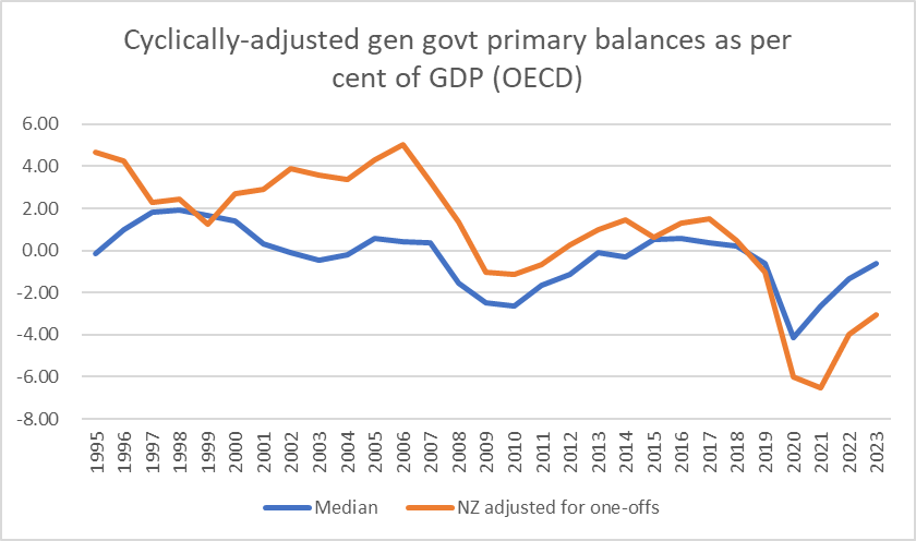 These international comparisons aren’t done on the New Zealand operating balance definition. On that metric, the cyclically-adjusted operating deficit will be a smaller percentage of GDP, but there is little case for a cyclically-adjusted operating deficit (paying for the groceries etc) at all.