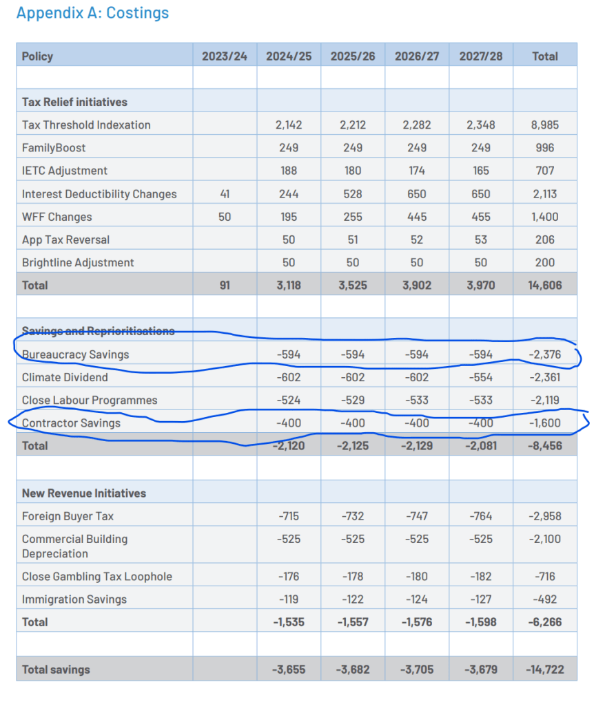 That is $4bn of the $14.6 billion cost of the overall package (30 per cent). I’m not disputing that there are (substantial) savings to be made, but savings made to finance tax cuts (as in this morning’s package) can’t then be used to also close the deficit. Both Labour and National talk of cutting consultant spend. That is cheap talk, unless (a) it amounts to a reduction in total spend, not just taking people onto the permanent staff (shifting the line item, but not changing the total, and b) identifying what work future governments don’t want done.