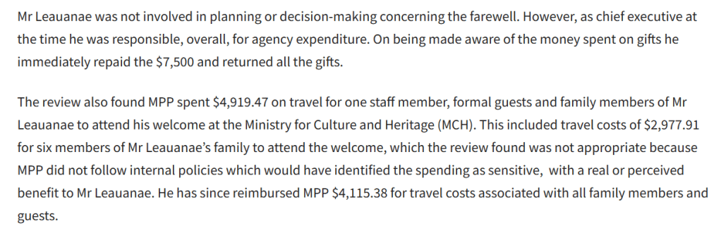 But that clearly wasn’t the case with the travel, because the second paragraph above says that it was the PSC review which uncovered the fact of this spending on Mr Leauanae’s family and friend’s travel, and that it was only in light of the review finding that he reimbursed MPP. And we know from the documents PSC released that they did not formally decide to look into the spending regarding the welcome to MCH until 19 June. That was eight months after the personal benefit to Mr Leauanae. That doesn’t seem even close to putting things right at the “first opportunity”, casts further doubt on Leauanae’s claim that he had always intended to pay for the travel himself, and strongly suggests someone with no strong sense of what is right and wrong when public money is being spent. Someone who still sits in a highly paid job as head of a New Zealand government department.
