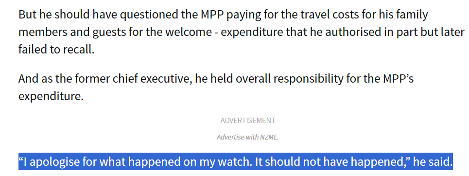 “on my watch”? He seemed to be trying to minimise what PSC had found had actually happened (written up in my post yesterday) and suggest that he himself hadn’t done much, but had after all just been the CE (so, in some sense, formally responsible but not really to blame). It was as if his wayward former underlings had done stuff that didn’t relate to him at all. What the PSC report actually described was Leauanae having accepted $7500 of taxpayer gifts himself at the farewell and then accepting $4000+ of travel for family members and friends for his welcome to MPP. (In addition of course to the rest of the extravagant $40000 spent in total on his farewell, as he moved from one small Wellington government department to another.)