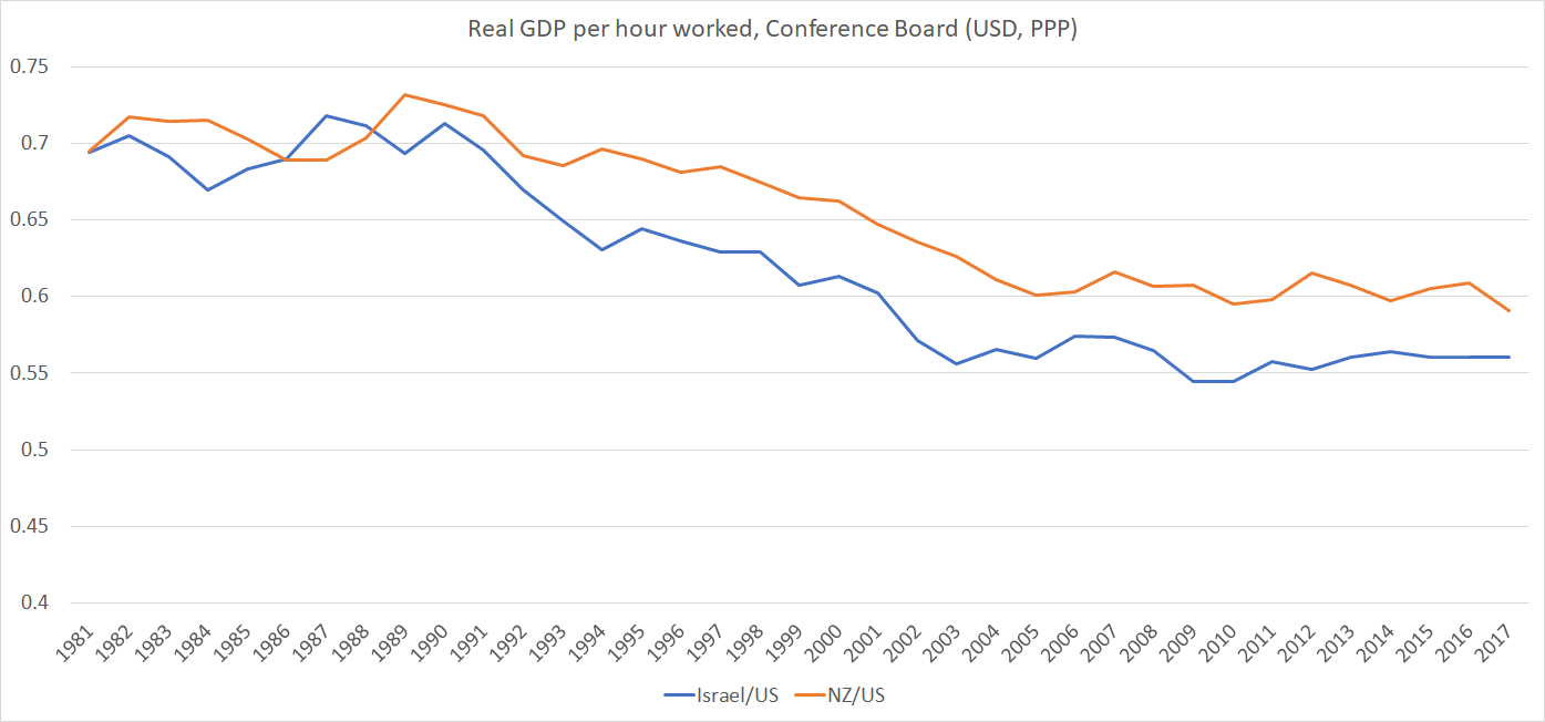 This chart shows the ratio of New Zealand’s real GDP per hour worked to that of Israel (both series also converted at PPP exchange rates).