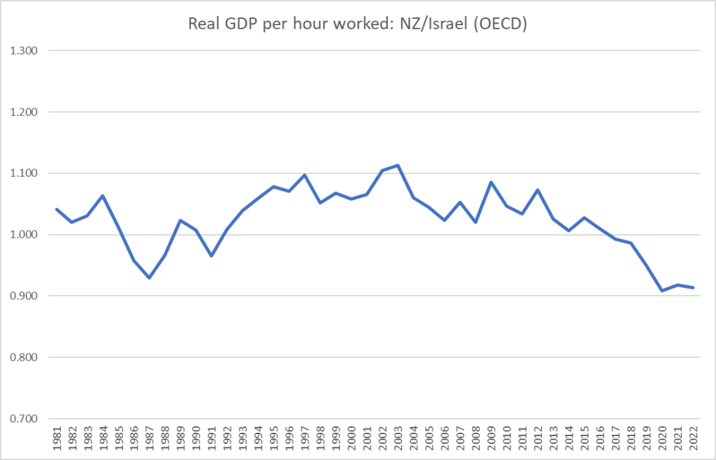 The last few years seem to have been quite good for Israel’s productivity growth, but I wouldn’t put too much weight on it yet. Not only has this ratio fluctuated over the years with no clear trend, but the biggest single lift in Israel’s reported productivity was for 2020 – the year of the lockdowns, when many countries saw a rise in measured average productivity (as eg low-paying low-productivity tourist jobs were lost) – and more recently many countries (including New Zealand) have seen a reversion to trend. (And it seems unlikely that the final quarter of 2023 is going to be a stellar one for Israeli average productivity.)