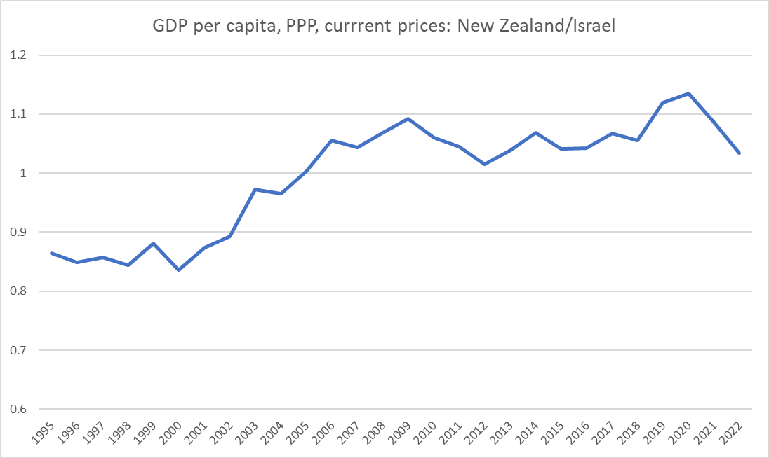 The grim events of the last couple of weeks, and a note from a reader last week about a short post I’d written several years ago comparing the economic performance of Israel and New Zealand, prompted me to take another look at the data.
