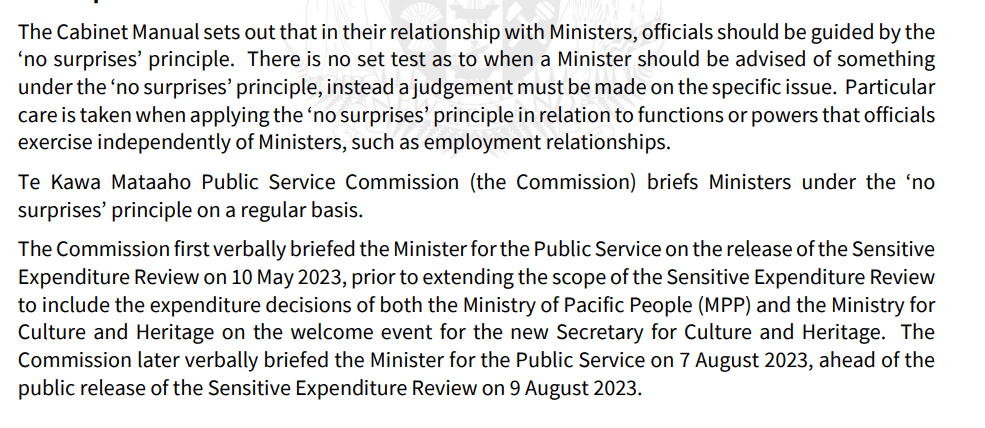 In other words, over the eight months from start to finish of this investigation and review, into what was revealed to be grossly inappropriate spending in a public service department, including considerable personal benefit for a senior public servant, PSC never once provided anything in writing to the Minister for the Public Service (when the process started that was still Hipkins), or to any of the portfolio ministers of the departments Leauanae had been (MPP) or was (MCH) chief executive of. Had some journalists asked the Minister for the Public Service in, say, early January about this issue/investigation, we are to suppose he would not even have been aware of the matter. Doesn’t seem very much in line with “no surprises”.