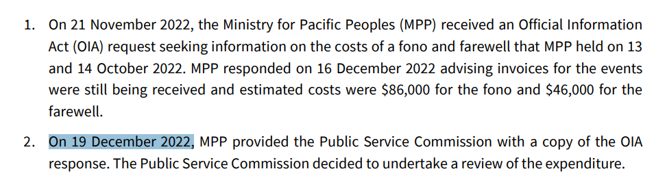 Not the Ministry for Pacific Peoples which arranged the lavish event in the first place, in clear breach of public sector standards (the written ones, but who knows if they were the lived ones), and then must have been not overly cooperative and proactive in the PSC inquiry, or otherwise it would not have taken until June before PSC finally became aware of the spending on Leauanae’s family travel. Shouldn’t PSC have asked early on, and MPP proferred it early on even if PSC didn’t ask, about all expenditure on or for Mr Leauanae and/or his family in (say) the preceding six months. You cast the net wide to be sure of capturing everything relevant. Unless you don’t care greatly, want to protect your former boss, and just want to do the bare minimum.
