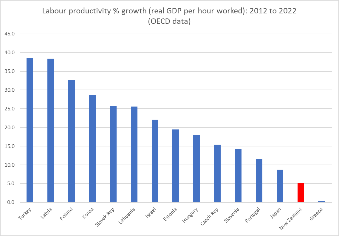 And New Zealand has done really badly over that decade, so badly in fact that of these far-from-frontier economies, only Greece did worse than New Zealand. And these were all countries that, being far from the frontier, had – in principle – significant catch-up or convergence opportunities. More than a few of them realised those opportunities. New Zealand languished.