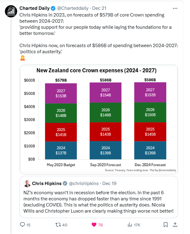 For all the pre-election rhetoric, the current coalition government seems to be keeping right on with the path adopted by the previous Labour government, which had more or less abandoned (for practical purposes) any serious interest in running budgets in which the revenue raised paid for the groceries. National wasn’t very ambitious in its election campaign fiscal plans, but its numbers now represent deep underperformance even relative to those modest electoral ambitions. Will we see a balanced budget ever under Luxon/Willis. Unless something positive just happens to turn up it seems very unlikely – and with each passing year the ageing population fiscal pressures just keep mounting. If the failure is first and foremost the responsibility of the Minister of Finance, no Prime Minister can ever escape shared responsibility for this kick-the-can down the road approach to fiscal management.
