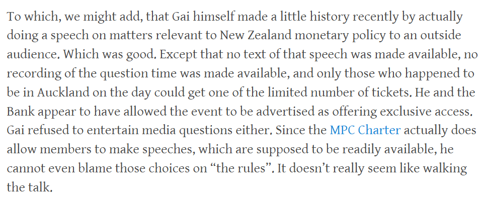 As I noted in my post last week on the new Governor, she has talked about improving transparency, and if the Bank follows through then that would be a good thing. But there is distinction between things you can be transparent about – the views, arguments, votes etc in any particular meeting – and things where you can certainly publish numbers but really there isn’t much value at all. Now, to be clear, market economists pay attention to those future tracks because the MPC produces them, and – if things are anything like what they were in my day – large amounts of time and effort goes into producing them (precisely because the MPC will know markets look at the track because the RB publishes it). But there is no substantive value at all – the MPC just does not have any decent idea what will be required 12-24 months ahead. Often enough – as we’ve seen this year again – they often don’t have a reliable or consistent view on the next quarter. Much better to focus energies on this quarter and next, recognising that almost all the information new to the Committee each time it meets is about the (quite uncertain enough) recent past with just a few pointers to the very near-future. You need mental models to think about medium-term implications etc, and perhaps formal ones for research purposes, policy scenarios etc but….forecasting really is a mug’s game, and in a central bank context the medium-term forecasts, notably for the OCR, add very little value.