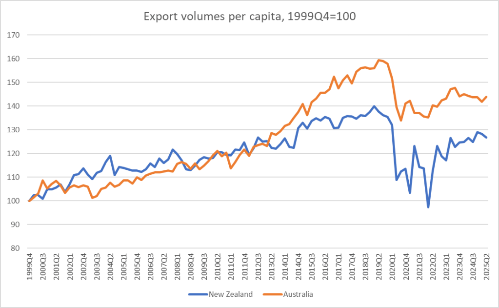 But time passes and I hadn’t noticed that exports from Australia – a country with a population more than five times ours – are now about as large a share of GDP as those from New Zealand. I put this chart on Twitter yesterday, with the observation that Australia itself is hardly a stellar success story.