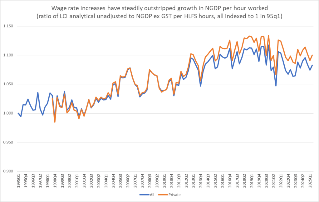 People don’t seem to find it very intuitive, but when the lines are going up wage rates (captured by the LCI analytical unadjusted series) are rising faster than nominal GDP per hour worked. When I first did the chart, perhaps seven or eight years ago, of course what caught my eye was the (quite strong) upward trend over 15+ years from about 2000. I saw it as another way of casting light on real exchange rate or competitiveness issues, and as not inconsistent with the inward skew to the economy apparent in the previous (tradables vs non-tradables) chart. Whatever the causes, relative to the capacity of the overall economy to pay (or generate income), wage rates were holding up strongly.