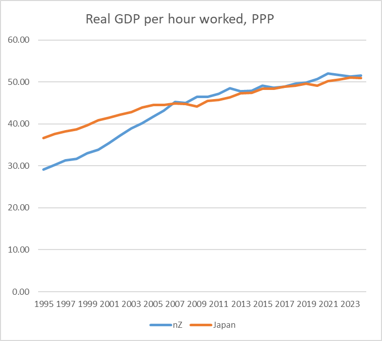 A commenter noted that in the first chart above NZ was just ahead of Japan. On this measure, we have been much the same as Japan for getting on for 20 years now.