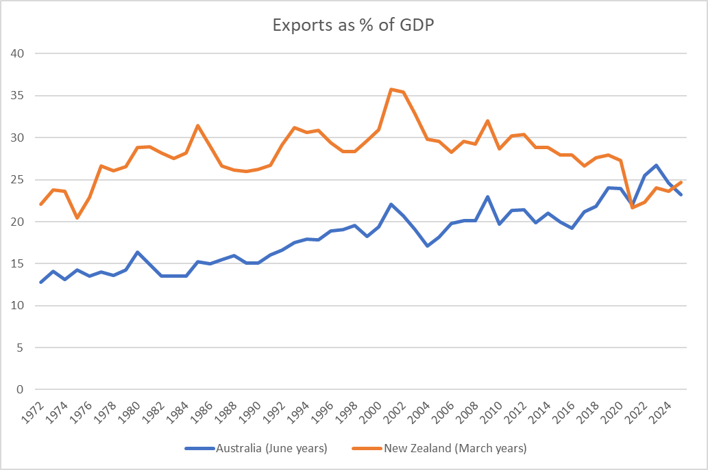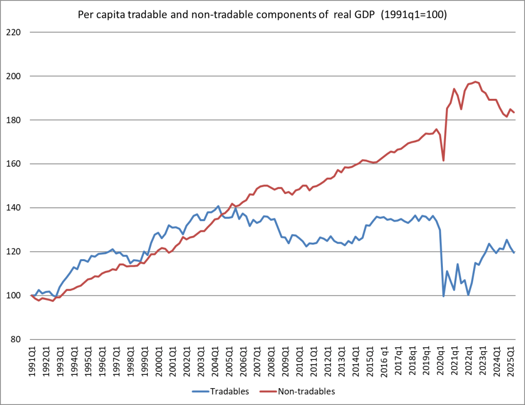 The dismal nature of the picture (and economy) is captured in that blue line. Not only has the pre-Covid level not been regained, but the per capita size of the tradables sector of our economy is way smaller than it was 20 years ago. Meanwhile, the non-tradables sector, after a Covid and overheated domestic economy interruption, seems to keep tracking upwards. It isn’t a sign of a healthy economy.