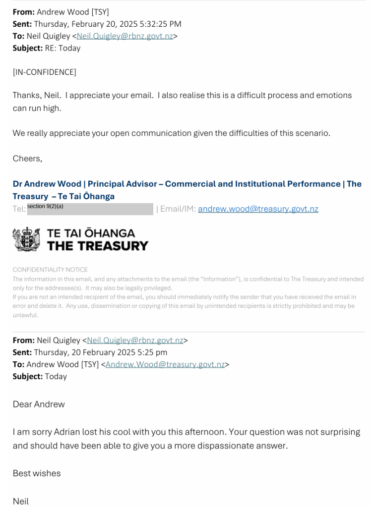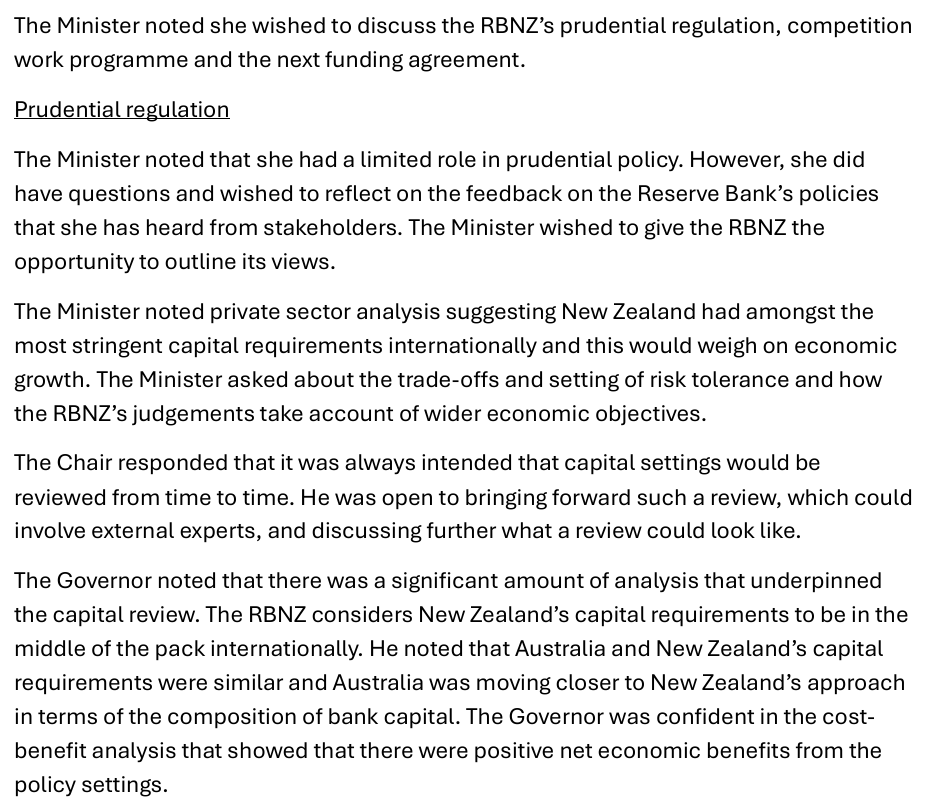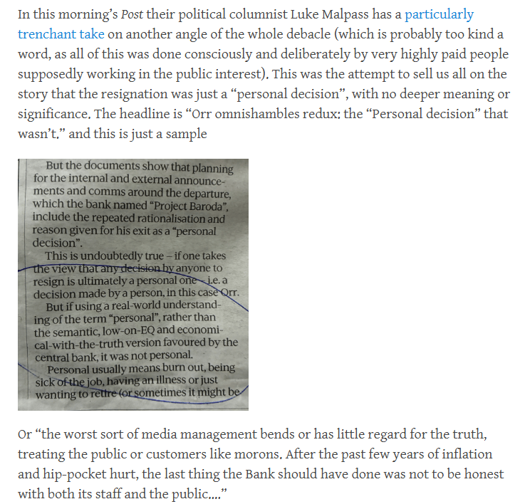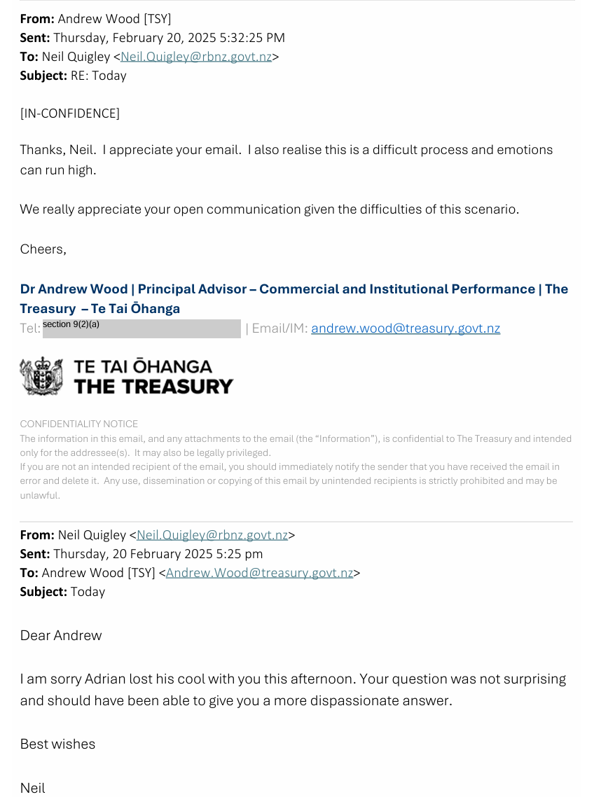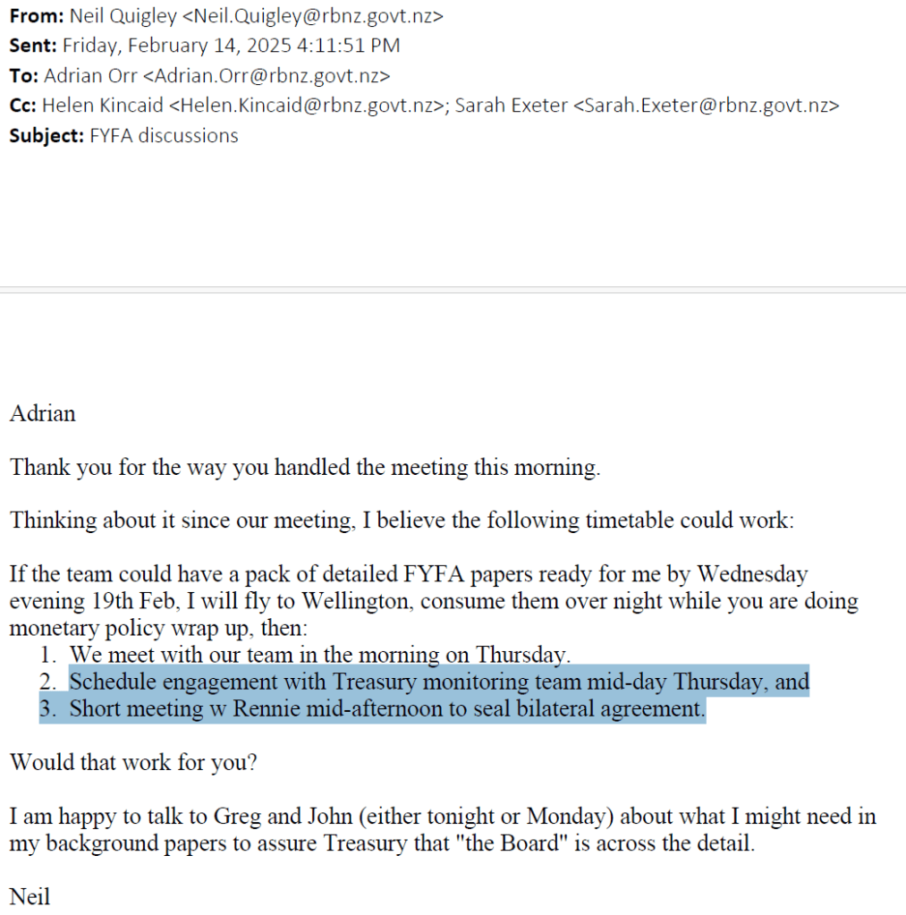 And that was the gist of the second limb of my request. In fact, it appears that none of this happened. Treasury never actually responds directly to that bit of the request but (a) does not say it is withholding anything, and b) notes that two documents are in scope and soon to be released (as part of the long-delayed pro-active release of papers relating to the 2025 Budget). The first of those is “T2025/3027 Aide Memoire: Preliminary assessment of the Reserve Bank of New Zealand’s funding proposal for the 2025-30 Five Year Funding Agreement”, and is dated 13 February. That appears to be the first time anyone at The Treasury had put anything in writing on an egregious funding bid they’d received five months earlier (from an agency with a chief executive who was well known for his aggression etc). It seems almost unbelievable, but there it is.