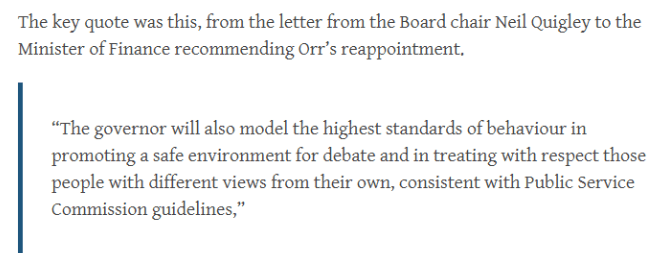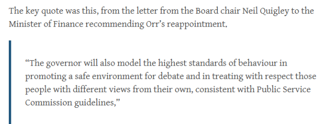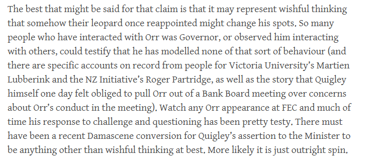 - And if “no work programmes have been cut” [“out altogether” appears from context to be the intended interpretation] a) what were all those people previously doing? and b) given all the non-core stuff the Bank got into under Orr, why on earth not?