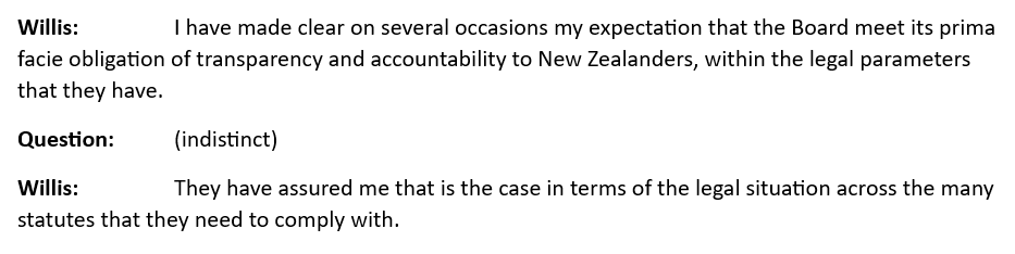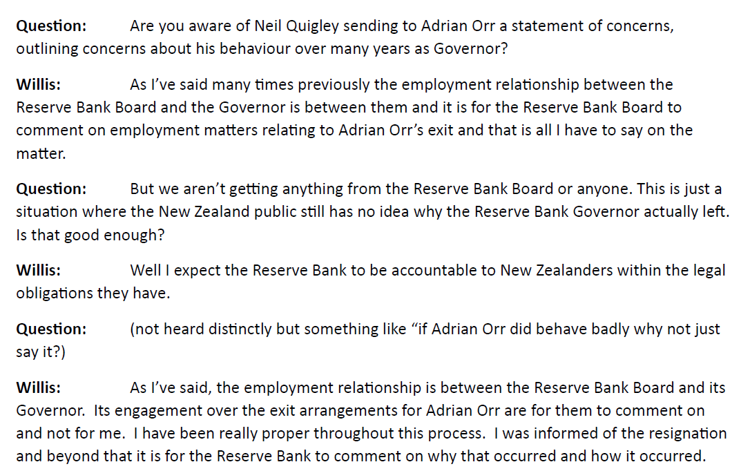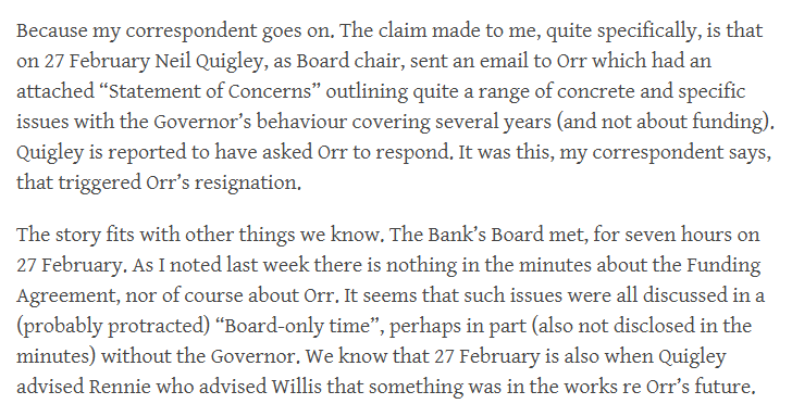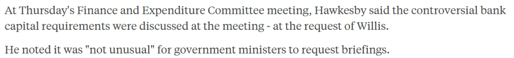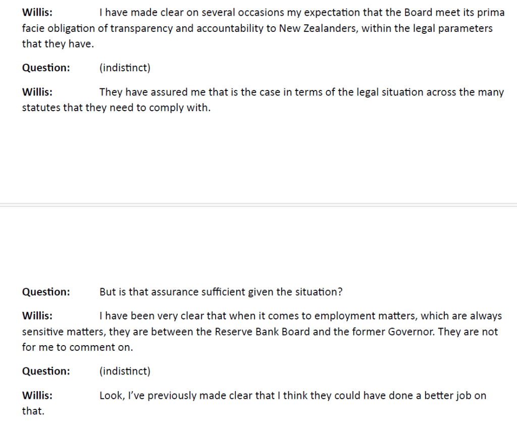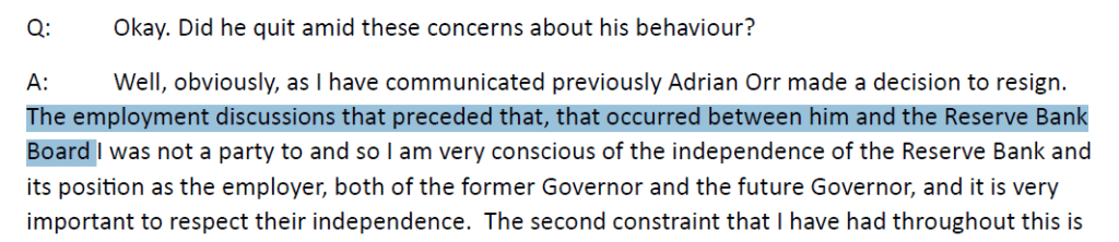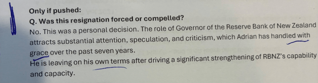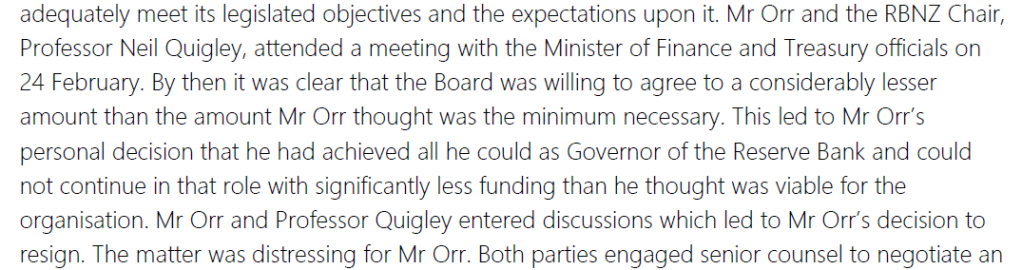 If so, one might – just possibly, and in a mood of charity – be marginally less unsympathetic to the Governor. Perhaps he really thought he was going to get away with a) the massive 2024/25 overspend, and b) the artificial baseline for the new Funding Agreement. After all, it seems there had been no Treasury challenge or scrutiny at all, and his numbers even seemed to have found their way into the official fiscal forecasts with no challenge or question. It is astonishing that for months – dating all the way back to that draft SPE – there seems to have been no serious pushback, from the Minister or from Treasury. What sort of job were top Treasury officials doing in monitoring this powerful Crown agency? Not much of one it appears. Deputy Secretaries (both now out of the jobs they held then) are recorded as having turned up for chats at Board meetings, but what of it if excess of this sort was allowed to roll on for months unchallenged?