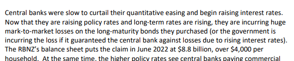 The (quite short) paper isn’t specifically focused on New Zealand and our central bank, and consistent with that the authors have secured a Foreword from Bill White, former deputy governor of the Bank of Canada, and then long-serving Chief Economist of the Bank for International Settlements, from which perch he irritated many with his warnings about system fragility in the years leading up to 2008. He is a really smart guy and what he writes is usually worth thinking about, and I’ve enjoyed various stimulating discussions/debates with him over the years. His views today, reflected in the Foreword, still stand out of the mainstream (rightly or wrongly). If he is keen on fiscal consolidation etc across the advanced world, he champions “significant tax increases, particularly on the wealthy”, and while suggesting this would be desirable but politically impossible then suggests that a heavy reliance on monetary policy may pose a threat to democracy itself. White appears to believe that we are on the cusp of a very substantial adjustment, as the public and private debt built-up over the last few decades is sorted out (“we must review carefully our judicial and administrative procedures to ensure the necessary debt restructuring, and there will be a lot of it, will be orderly rather than disorderly”. Perhaps, but it is a long way from debates about how monetary policy has been run in the last 2.5 years or so. (And, for what it is worth, New Zealand has low public debt, and (for ill) its housing debt remains underpinned by governments and councils that refuse to free up land use on the margins of our cities.)
