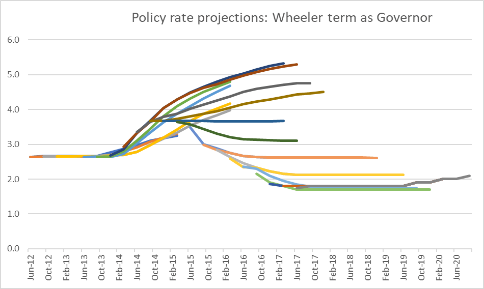 Well, one person who might was Governor Graeme Wheeler over the period from about 2013. He was convinced – quite convinced – that the OCR was a long way below its neutral level, and that large increases would be appropriate to get things back in check. So much so that in late 2013 he was openly asserting (in public) that 200 basis points of OCR increases were coming (any conditionality was very muted). These were the 90 day/OCR forecasts the Bank published while Wheeler was Governor