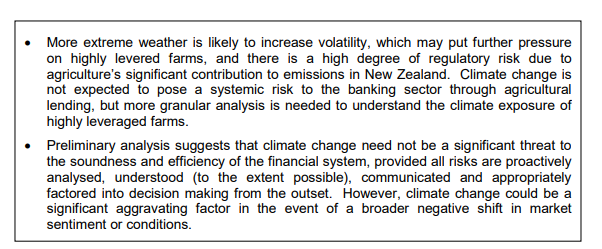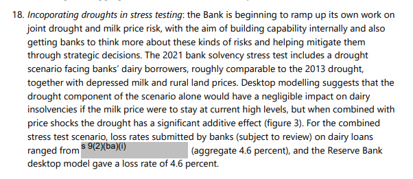 The rest of the OIA release consisted of 15 pages of a Powerpoint presentation (from July 2021) on that dairy scenario, reporting work undertaken jointly with MPI (the Ministry for Primary Industries). Much of the presentation is withheld, and we really learn nothing from it beyond what is in that extract just above. None of this appears to have been independently reviewed, none of it has been published, and the Bank’s own description (see quote above) is that there is “very little” New Zealand research on the (possible) threat to the financial system. All we have is a statement of the fairly blindingly obvious: a serious drought out of the blue (as 2013 was) combined with low dairy prices – an unusual combination given that earlier Bank research found that New Zealand droughts tended to boost global dairy prices, but not impossible – would result in some losses to banks’ dairy loan books. And? It sheds no light at all on risks to the New Zealand economy and financial system as a whole, and especially not from climate change – a multi-decade process.