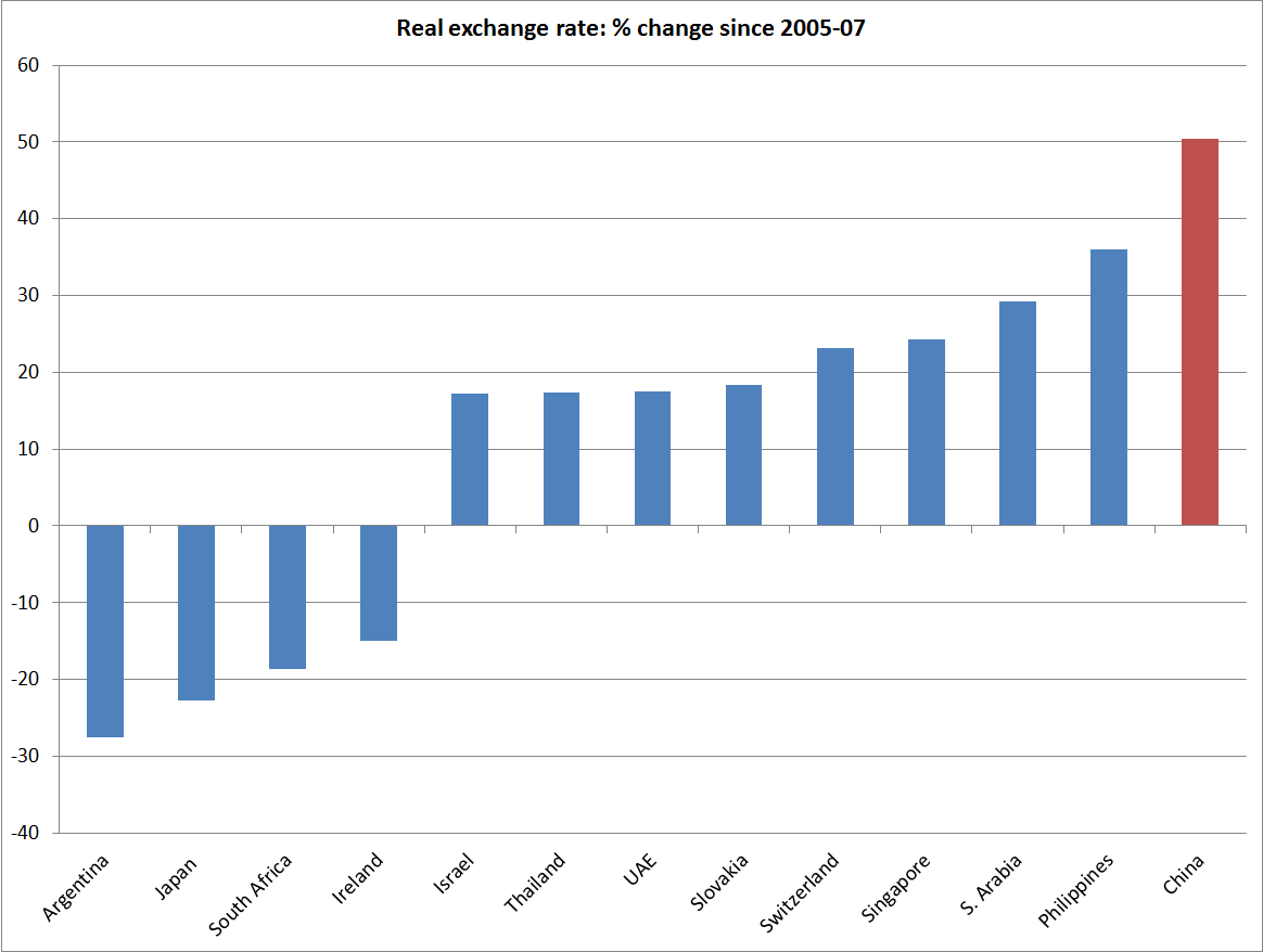 - even being in the euro is no protection from considerable real exchange rate variability if the fundamentals of your economy aren’t closely aligned to those of the large country(or countries) you are pegged too – see Ireland and Greece.