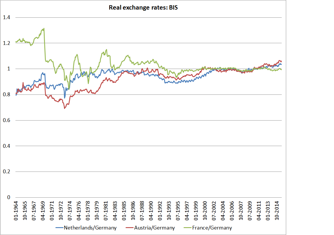 As a simple illustration of differences in real exchange rate volatility, I took the first two countries on an OECD table (Australia and Austria) and showed their real exchange rate since the start of 1999 when the euro began.