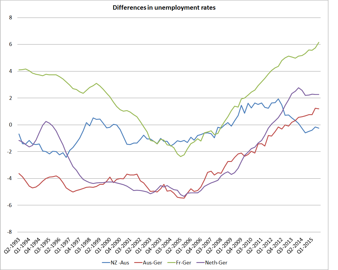 Countries make choices about their exchange rate regimes – and thus about their monetary policy regimes. Some choose to fix their exchange rate, some to float, some to form common currency areas, and some to manage a non-fixed exchange rate (eg Singapore). Of course, choices about exchange rate regimes are influenced by real structural features: it might make a lot of sense to fix to a major trading partner if your two economies are very similar, but it probably wouldn’t if your two economies were regularly exposed to very different shocks, or if there was no dominant trading partner at all. Exchange rate regimes may change trade patterns a little, but they won’t change the underlying structural differences in two economies.