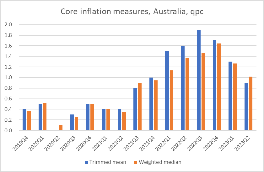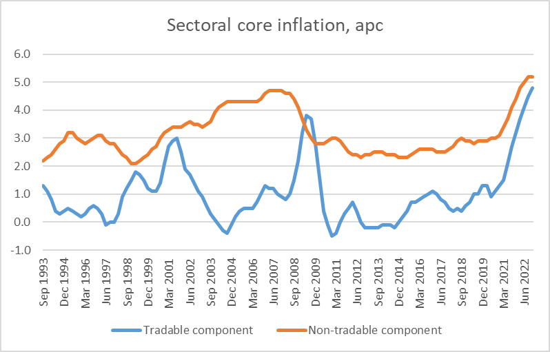 To me, the issue now is not whether core inflation is going to fall. It seems most likely that it will finally begin to (and although overseas experience in by no means general, perhaps the US, Canadian, and Australia recent experiences offer grounds for hope) but rather how far and how slow the reduction will be. We need large reductions in core inflation, not just the beginnings of a decline, and two years into the tightening cycle we need to see large reductions soon. Perhaps it will happen with what has been done already, but that seems more like a hopeful punt than a secure outlook. One thing we should be looking for tomorrow, especially if the MPC does nothing, is some serious analysis illustrating their thinking as to why it is that core inflation here has not yet fallen (whereas, for example, it has in the US, Canada, and Australia). I don’t know the answer myself, but with all the resource at their disposal we should expect the MPC to make a good fist of a compelling story.
