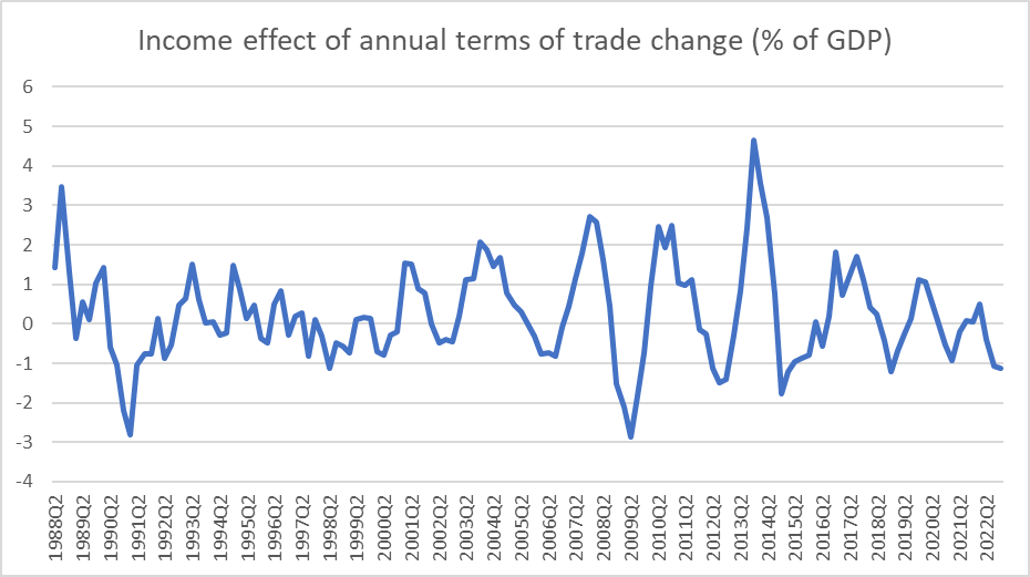 The world economy, and the travails of China, have got some attention recently. That global uncertainty will no doubt be cited by some, including around the MPC table, as reason for waiting. I’m not convinced, partly because over the decades I’ve seen too many occasions when such potential global slowdowns have been cited as an argument, only for them to come to not much. Relatedly, over the years one of the most important ways global events affect New Zealand has been through the terms of trade. A serious global slowdown might be expected to dampen the terms of trade (and thus real incomes and demand relative to the volume of domestic output) but…..