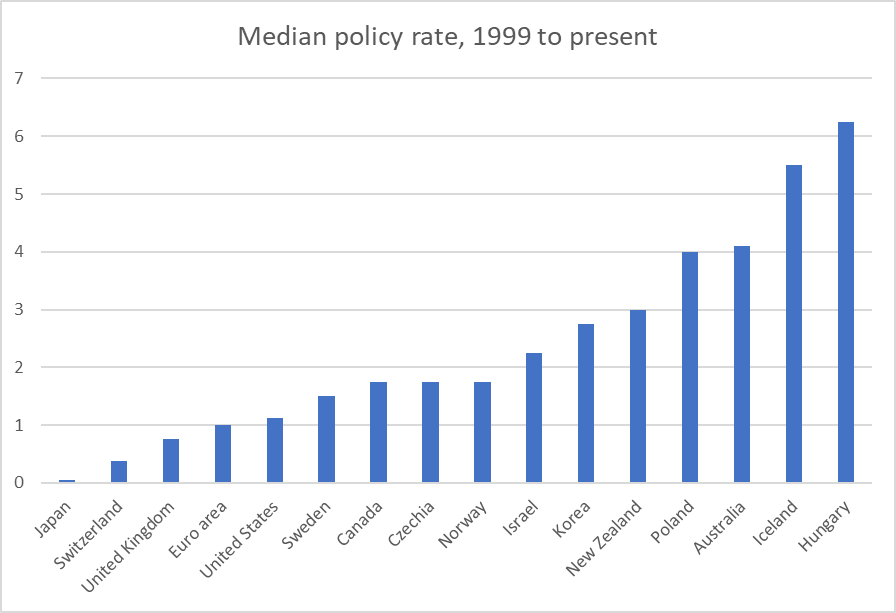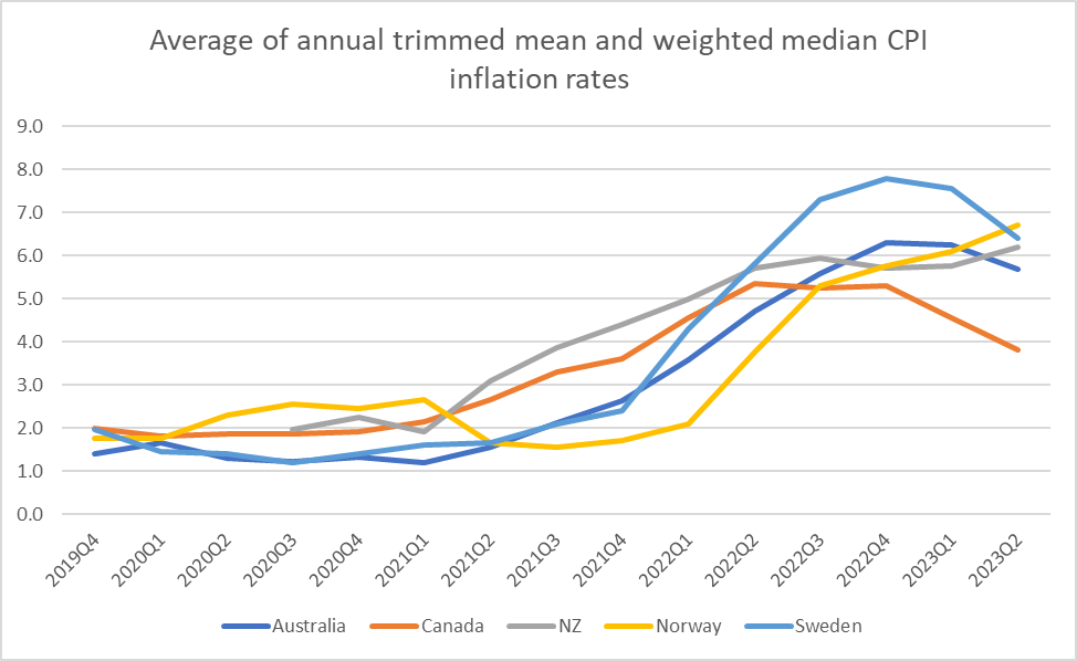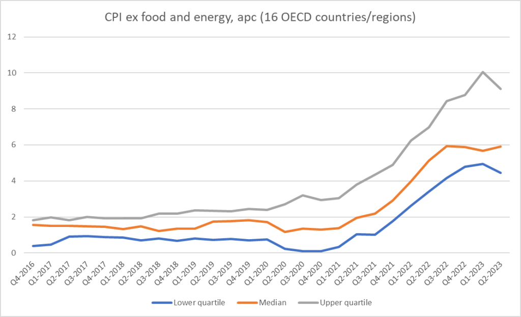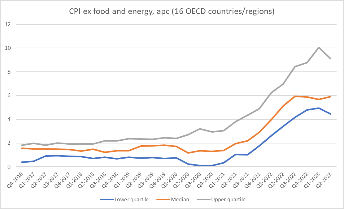 I wrote a post a couple of weeks ago looking at what had been happening to monetary policy and inflation across a bunch of advanced economies in the light of the complete suite of June inflation data. I’m not going to repeat all the analysis and discussion from there, and nothing very much has changed in the published data (for real nerds, still disconcertingly high Norwegian core inflation has come back down again after rising the previous month or two). But some key relevant points were: