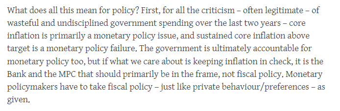 It is certainly true that if the Bank had begun to raise the OCR a little earlier in 2021, it would not have made that much difference to inflation (core or headline) now. 25 basis points in each of May and July 2021 might together have lowered headline inflation by September 2022 by half a percent at most. But in this framing – also in their recent Review – there are two elements that are little better than dishonest. Purely with the benefit of hindsight (their own criterion) it is now clear that monetary policy should not have been eased at all in 2020, and that monetary policy should have been run much tighter over the period since then. Had that been done, core inflation would have stayed inside the target range. Now that might be an impossible standard, but that is simply to point out what I noted in my post on the Review was the major weakness: there was just no sign the Bank or MPC had devoted any serious thought or research to trying to understand what they (and everyone else) missed in 2020 and 2021. But they were responsible.