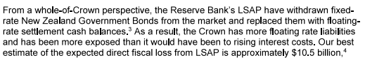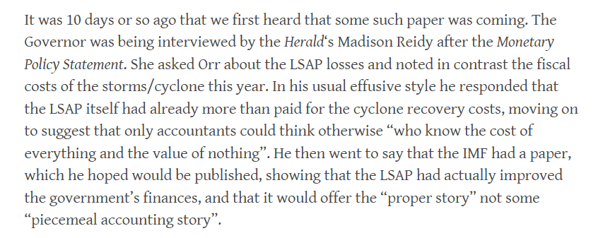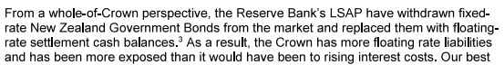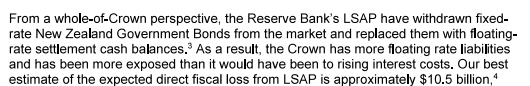 Actually, it was all on the Reserve Bank. An internal working party in 2012 had recommended (I chaired it) that the Bank ensure our own systems and those of banks were able to cope with negative rates should they ever be needed. The then Governor accepted those recommendations, but it seems that nothing happened until it was far too late (it wasn’t until Covid was almost upon them that the Bank realised nothing had been done and some banks – apparently it wasn’t even all – weren’t operationally capable). It is all the more extraordinary because in the second half of the decade the Bank had clearly been doing preparatory thinking for coping with the next severe downturn – there was a thoughtful Bullletin article on options in 2018, and of course that serious interview of Orr’s I’d linked to earlier. But no one seems to have done the basic engine-room sort of work, reviewing with banks their ability to cope with an instrument used in other countries for many years by then. There was turnover at the top – Orr came on board in March 2018, Hawkesby in March 2019 – but it isn’t as if in mid 2019 these should have been remote issues (the OCR had been cut to its then lowest ever level of 1 per cent, and it wasn’t going to take a particuarly savage shock to put zero in view). And yet nothing was done and – on the Bank’s own telling – the cost to the taxpayer was the full $11 billion or so (since they themselves now say they could have had the macro benefits they claim without the risks/losses if only they – Orr, Hawkesby, the 2019 MPC – had ensured basic operational readiness). That was on them, and only them. (Incidentally, the Bank reckone that by Q42020 those issues were sorted out, and yet they went on taking additional LSAP risk – and then incurring further losses – well into mid 2021.)