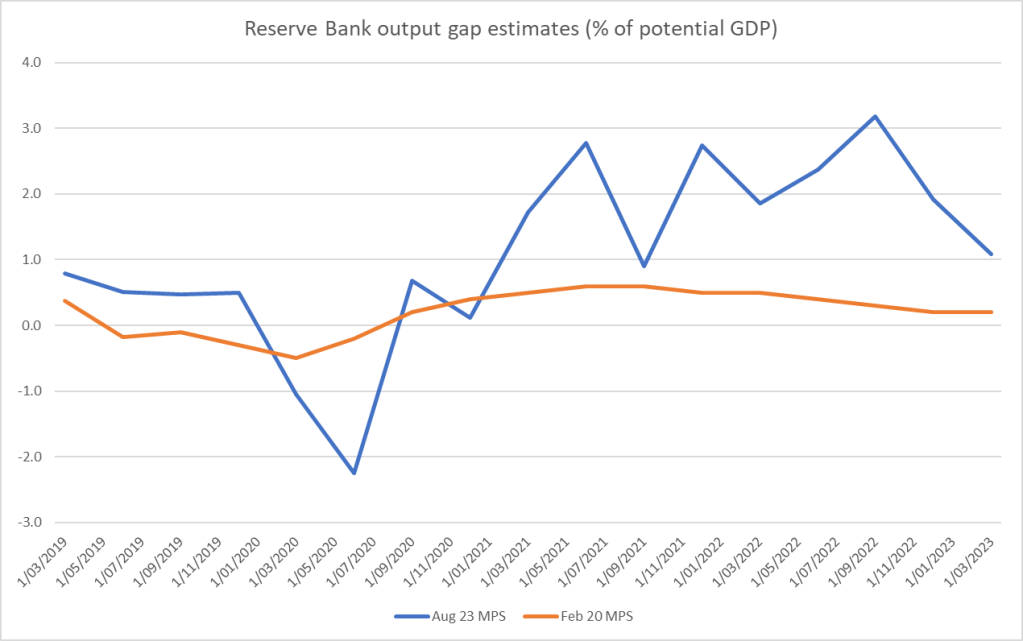 - ultimately the major failure was a forecasting one. On the path of forecasts as they were in 2020, 2021 and early 2022, the Bank would still have wanted to be providing lots of monetary policy stimulus for a long time (that is what forecasts of very low inflation and large negative output gaps tell central banks to do – and contrary to Conway’s claim, this had nothing to do with the 2019-2023 specification of the Bank’s target; it would be the same today). Thus, the path of inflation would have been very much as we actually experienced it.