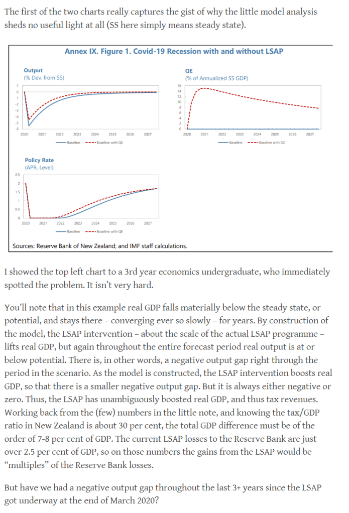 The centrepiece of what the Bank released last week is an Analytical Note by some of their researchers and some IMF staff which uses a model developed at the IMF to attempt to show that really the LSAP was a great success – macroeconomically and that it paid for itself (notwithstanding the $11 billion or so of direct losses incurred). It is a more elaborate version of the framework used by the IMF in a brief early note attached to their 2023 Article IV report (and talked up at the time by the former Governor as offering the “proper story” not some “piecemeal accounting story”), a piece whose claims I unpicked in a post at the time (link a couple of lines up).