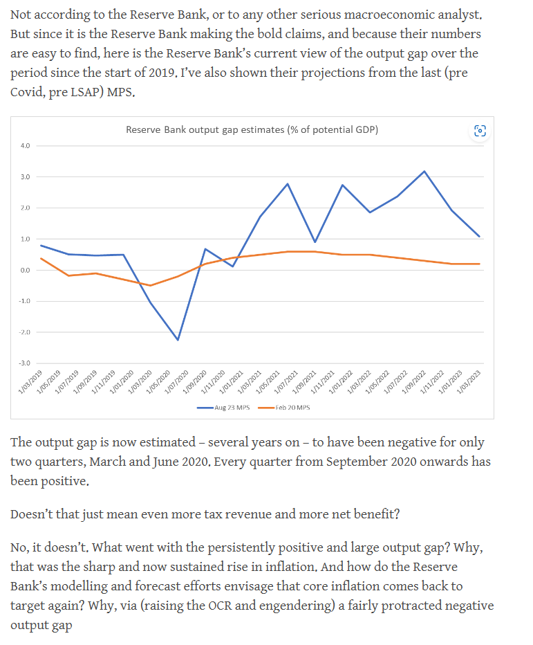 which a casual reader might think was all gain. But the chart ends just around the point where the output gap crosses into negative territory, and thus completely – and deliberately (we must assert for a senior policymaker) – ignores the more recent period, in which the Bank estimates that we are now in a materially negative output gap, and will in time have had three years of a negative output gap (ie GDP tracking below potential, with government tax revenue consequences). Pretty much all observers ascribe that negative output gap to the necessary working off of the earlier, marked, RB-allowed/enabled overheating (ie dealing with the inflation). Any honest reckoning of the fiscal consequences needs to take into account the entire period. There probably were some fiscal gains from the Bank’s monetary policy choices – surprise inflation reduced the real debt burden, and resulting fiscal drag picked up some extra revenue – but I doubt the Bank really wants to claim credit for that inflation they weren’t supposed to be aiming for and did not forecast.