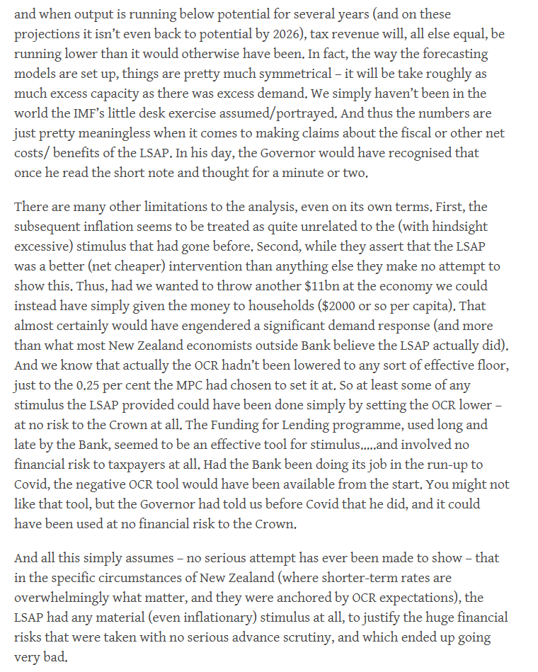So much money has been lost by central banks in the Covid QE interventions – in countries across the advanced world – that too many of those institutions, and their institutional allies (places like the IMF), now seem determined to try to prove a very weak case, that it was really all worthwhile (a case only made harder given the inflation mess that many advanced countries then went through, and which we are still living with the aftermath of). The effectiveness of generalised QE in government bonds – as distinct from specific interventions in dysfunctional markets – has been debated for 10-15 years now but my prior going into Covid was pretty much that of the eminent UK economist Charles Goodhart who in a Foreword to a book I reviewed some years ago (book completed just prior to Covid) opined that in his judgement:
