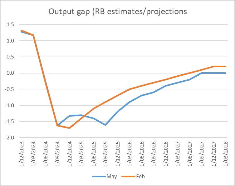 You can also see that with this chart, showing the Bank’s successive estimates of how much excess capacity was going to be needed at peak to get inflation down. In the scheme of things – data uncertainty, revisions etc etc – those estimates have really been quite stable.