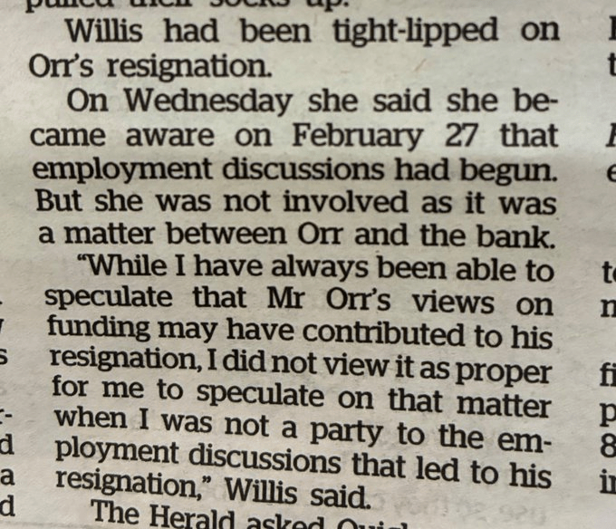The journalist was obviously a bit of an Orr fan, as this article is the second time in two days The Post has talked of Orr’s “reputation for being charming”. No doubt he could and did turn it on when he chose, but not, surely, ever to anyone who ever challenged or disagreed with him (that included – very evidently – Nicola Willis when on occasion as Opposition finance spokesperson she asked Orr a slightly uncomfortable question at FEC hearings).