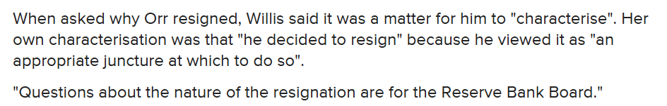 It doesn’t seem at all impossible – and I’m not sure any OIA so far (that I’ve heard of) would have captured this – that she, or someone senior acting on her behalf, got hold of Quigley (keeping Rennie in the loop) and indicated that Orr’s performance was intolerable, and that he really had to go. The specific incidents may have been like a heaven-sent opportunity, with Orr laying himself open, by having openly embarrassed the Board chair and Board as a whole, at a very delicate time re the Funding Agreement, by egregious behaviour – unacceptable in any official – in front of the two groups (MInister and Treasury) they needed to avoid antagonising to try to get a decent settlement. Perhaps Quigley intimated that he had a long list of behavioural issues re Orr that he’d built up over several years, and reckoned the Board would probably have had enongh too. Both sides will have known that only the Minister could fire the Governor – and she wouldn’t want to have done that directly – but it will have become apparent that they had leverage and could put pressure on, that would be likely to result in his “personal decision” to leave. And if something like that is what went on, maybe the Minister – conscious of maintaining semi-plausible deniability – indicated that whatever it took should be done, and don’t bother me with (or show me) the details.