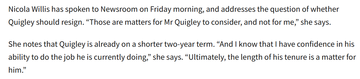 The Minister’s main message yesterday – to various outlets – was that she still had confidence in Neil Quigley as Board chair (which since she could have fired him at will and hasn’t we pretty well knew that by revealed preference).