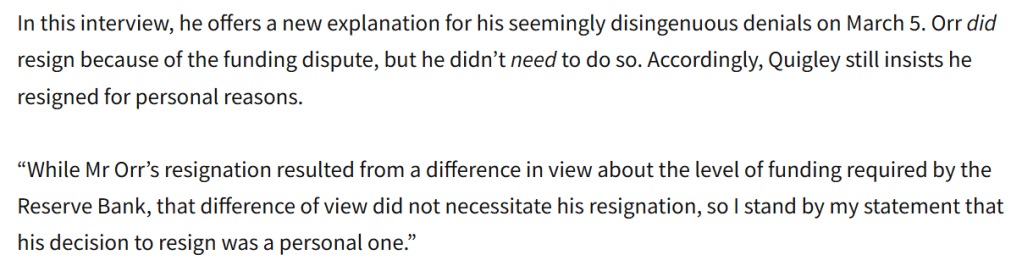 So far, we’ve had two quite different stories from Quigley, neither of which appears to be the truth. First, back on 5 March we were assured it was just “a personal decision”, with denials of any policy or conduct or similar issues being involved. We were intended to believe the man was tired, the job was done, and it was time to do something else. Then on 11 June, the Bank’s carefully crafted statement told us a new story. In this story there had indeed been material differences between the Board and the Governor over what they could live with in the next Funding Agreement. This we were told