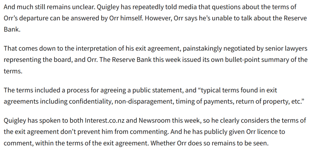 The Minister continues to state that she does not know the contents of the exit agreement then negotiated between expensive senior lawyers for both the Board and Orr. Which, on her account of what went on, should be simply extraordinary, because (a) the resignation would have to come to her, and b) she is the only guardian of the public interest here, and the one who would, in principle, have to account to Parliament for any deals done. She and her office, or at very least Treasury, should have been all over any terms – especially around non-disclosure matters – Quigley was agreeing with her (outgoing) Governor. And yet we must presumably take her at her word that she was not, and the OIAed paper trail suggests no Treasury advice on such matters at all.
