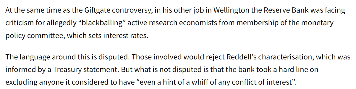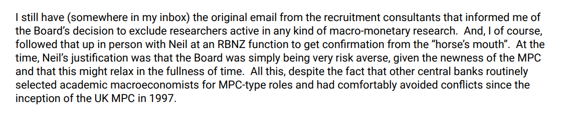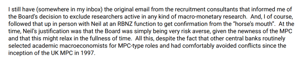 But the problem is that we (and they) are starting from things as they are, and it is hard to see anyone with even a modicum of interest could have any trust at all in our powerful independent central bank and those who run it. There have been repeated policy failures, bloated budgets (and spending last year left to run wild while the Minister did nothing to rein in the Governor or Board chair), lies to Parliament, lies to the Treasury (see final bit of this post on Quigley and the first MPC), pretty weak (or worse) policy communications, top tiers of management currently held by people simply not fit for the job, a Governor with serious behavioural issues left unchecked for years, and now all this……the active misleading, the cover-up, and (from the chair) the sheer disdain for any sense of public accountability or interest. Oh, and a Minister who did nothing about any of this for her first year or so in office – about conduct, about fiscal excesses, about replacing the chair, about filling board vacancies, about simply insisting on something a lot closer to both excellence and openness.
